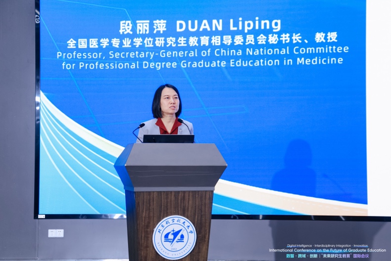 段丽萍做了《数智赋能 面向未来 医药学研究生数智化教育平台构建与实践》的报告。首先,她强调医学教育应对标国家政策,顺应时代潮流。接着,段解析了医药学研究生核心能力与课程标准体系与质量问题。最后,介绍了全国研究生数智教育平台构建与实践,提出构建AI+医学教育新生态,实现核心课程全覆盖与国际化对接,打造“医-工-管-教”的跨学科协同路径。
