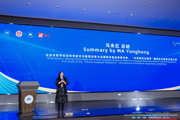 闭幕式上,各分论坛主持人进行总结汇报。马永红对本次会议进行了全面总结。她肯定了本次会议召开的重大意义,指出会议呈现出鲜明的“全球性”特点,汇聚了全球不同区域的学者、学生、政府官员与企业代表,并得到了国际组织的支持。大会紧扣“数智、跨域、创新”三大关键词,为与会者提供了跨界对话的平台,深入探讨了数智时代未来研究生教育发展这一核心议题。在展望未来时,她表示,尽管未来充满不确定性,但这正是需要学界共同探索的方向。最后,她鼓励所有同仁坚信人类文明的进步,携手创造美好的未来。