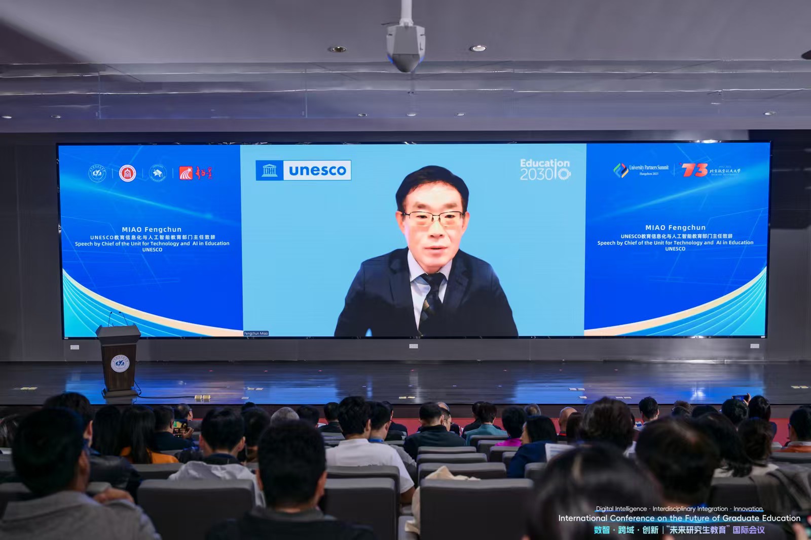 苗逢春在致辞中指出,当今世界正处在人工智能时代的转折点。他分享了两点体会:第一,人工智能目前的发展本质上处于基建扩张期,应从其对社会经济基础设施升级换代的角度分析价值;第二,包括研究生教育在内的人才培养应着眼于以人为本的人工智能公民素养和综合能力培养。最后,他介绍了联合国教科文组织2024年9月发布的学生人工智能能力框架,强调将以人为本的人工智能意识和伦理列为重要能力。