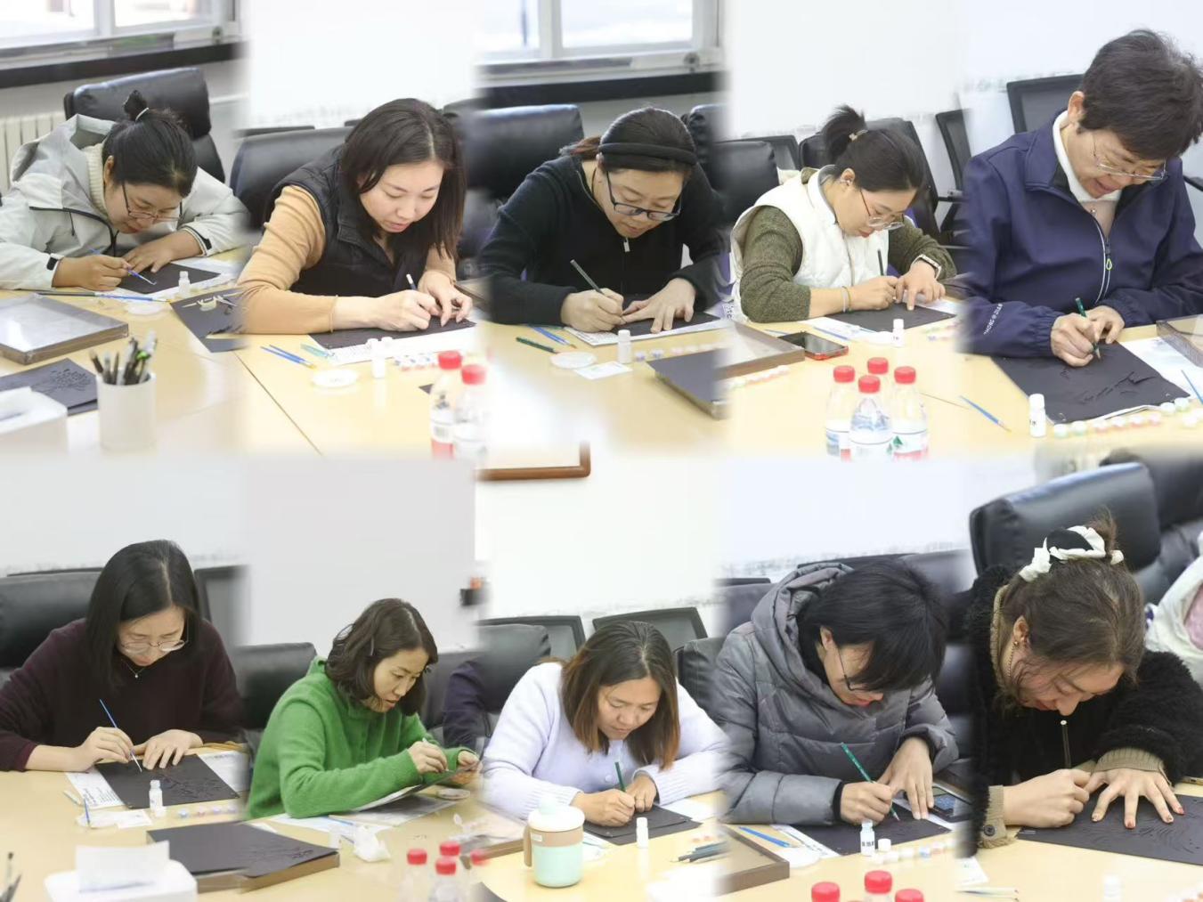 螺钿制作过程中,老师们兴致高昂、专注投入。作品图案涵盖灵动动物、盛放鲜花等多种创意形式,既有传统纹样的古典雅致,又融入个人审美巧思。老师们相互交流经验、彼此协助配合,现场氛围温馨融洽,在指尖创作中感受非遗工艺的独特魅力,舒缓工作压力、陶冶生活情操。
